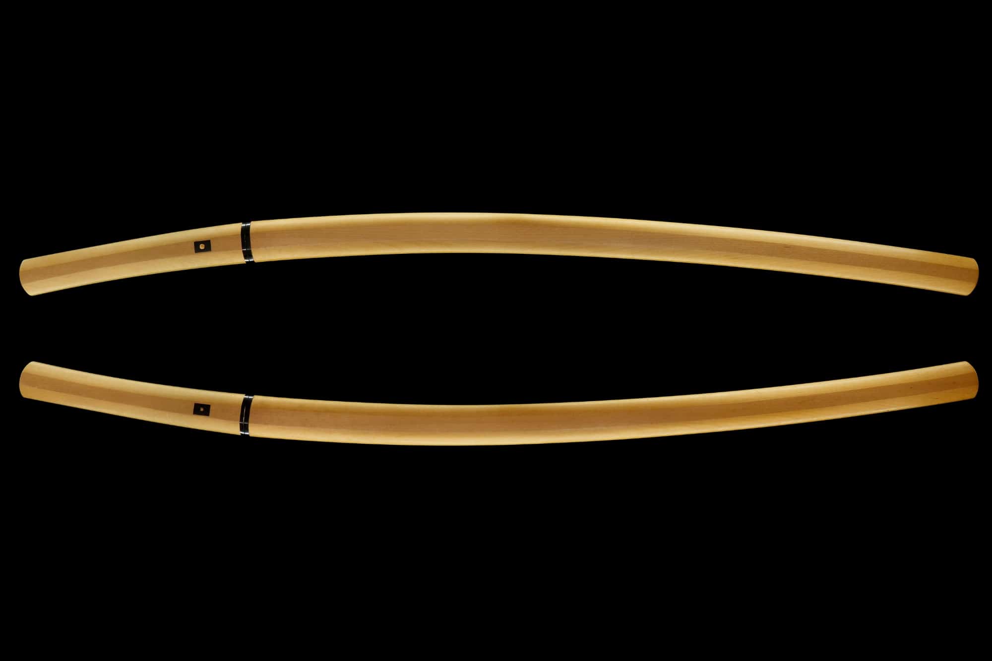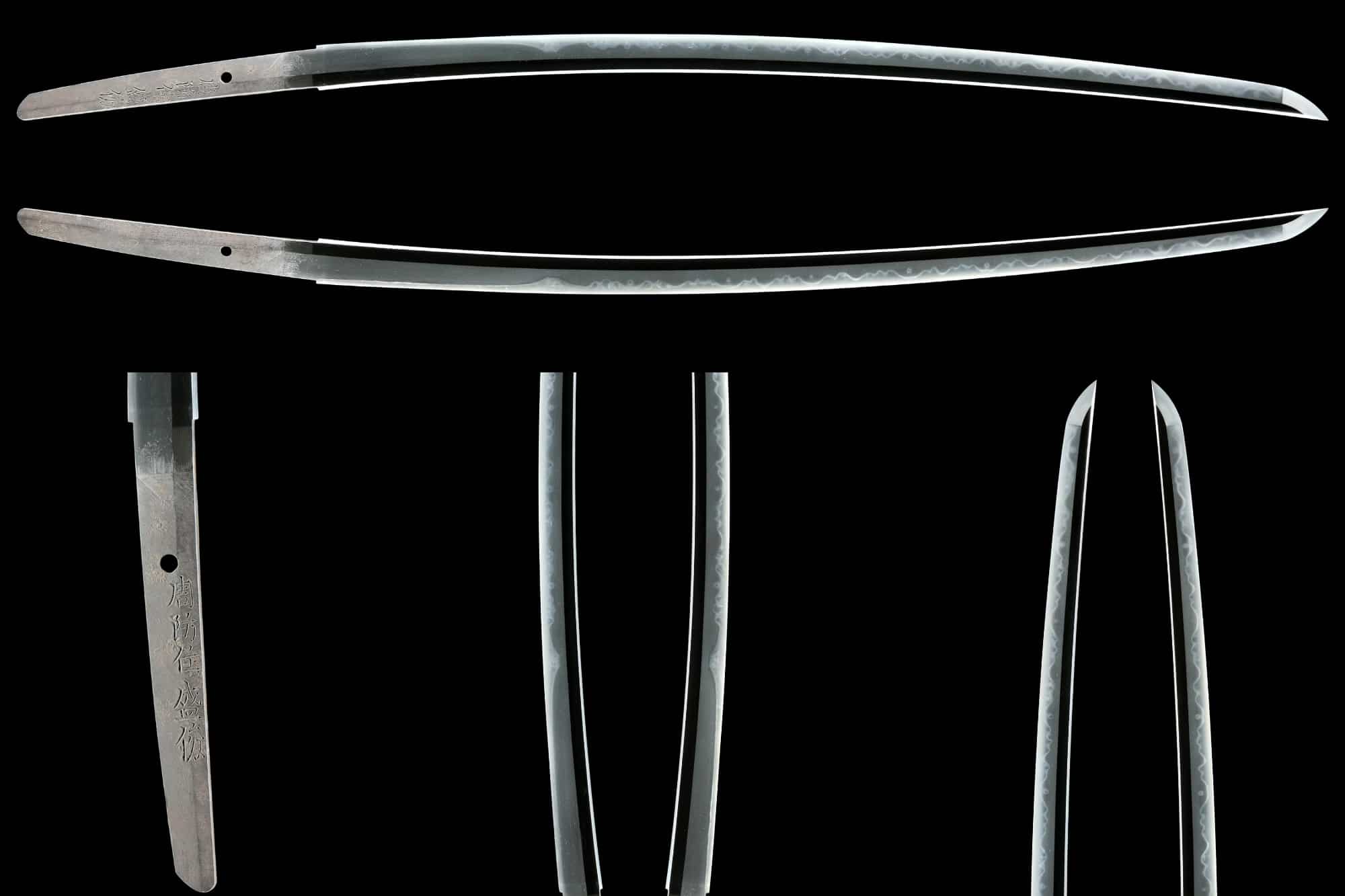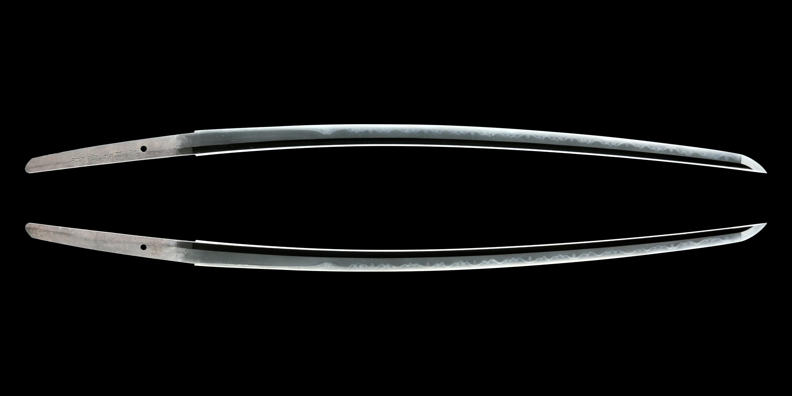 The blade shows a graceful, high-curved sugata, forged in a tight ko-itame hada with a luminous surface and gunome-midare hamon evoking the outline of Mount Fuji. Deep nioi-kuchi, lively ashi, and refined activity across the hamon reveal the superb heat control of a seasoned master. The sword feels perfectly balanced in hand—a harmony of beauty, strength, and precision.