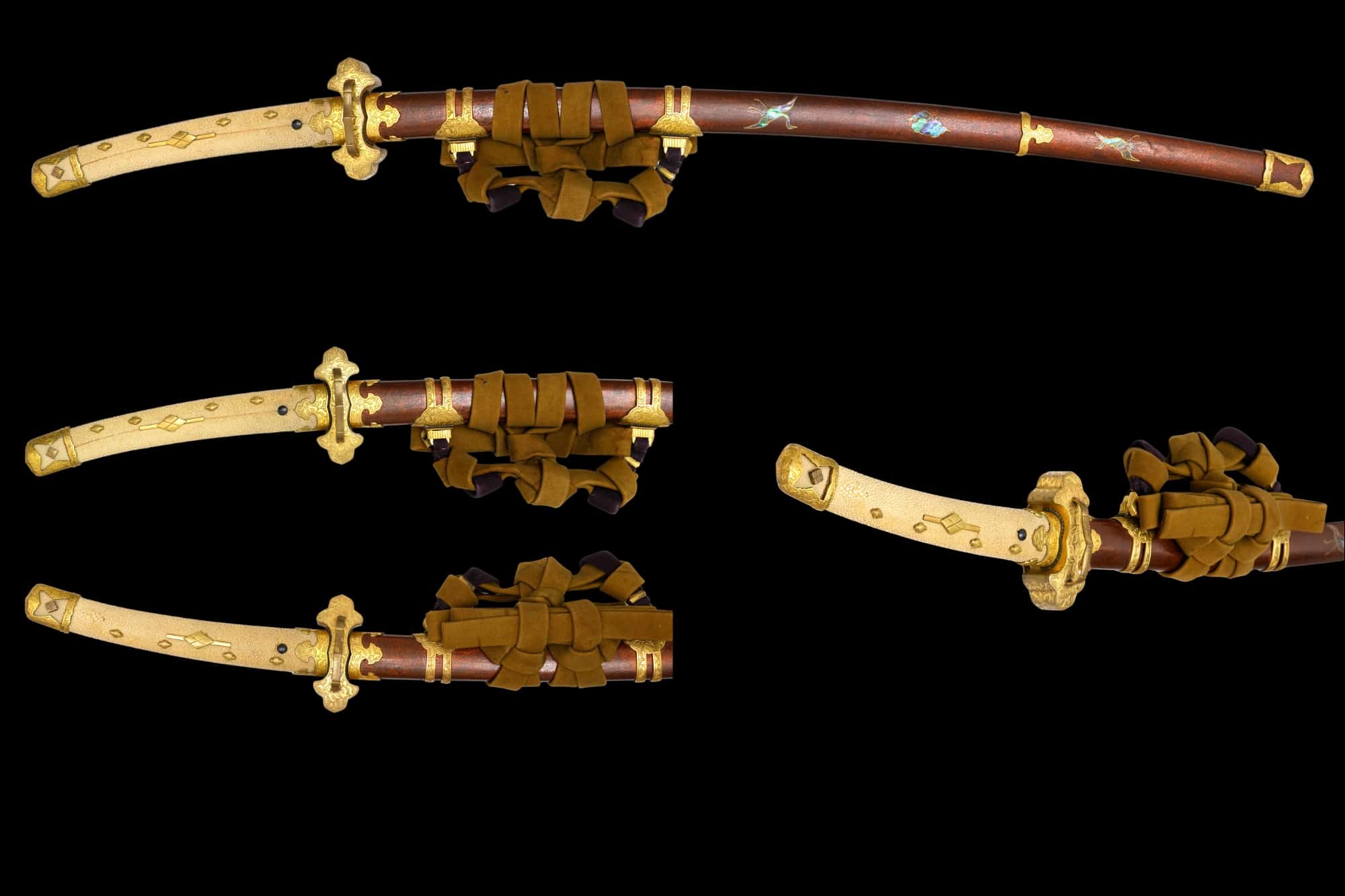 Its fittings are richly decorated with crane and cloud inlay in gold and silver. In Japanese symbolism, the crane (tsuru) represents longevity, loyalty, and eternal good fortune, often believed to live a thousand years. The clouds (kumo) signify divine presence and heavenly ascent, expressing purity and peace. Together, they embody noble protection and spiritual elevation—perfect themes for a guardian’s sword.