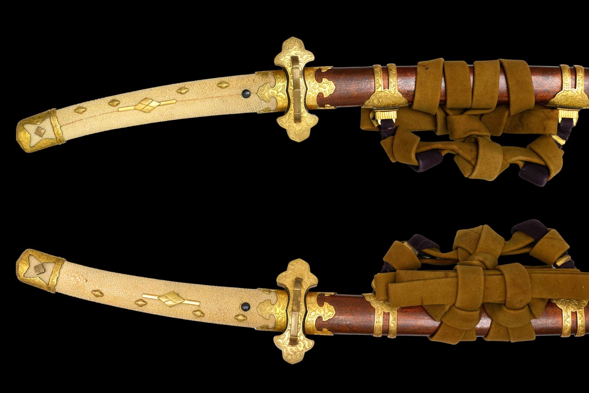 Fittings: Gold and silver inlay with diamond-mon crest on hilt, double gold-plated habaki