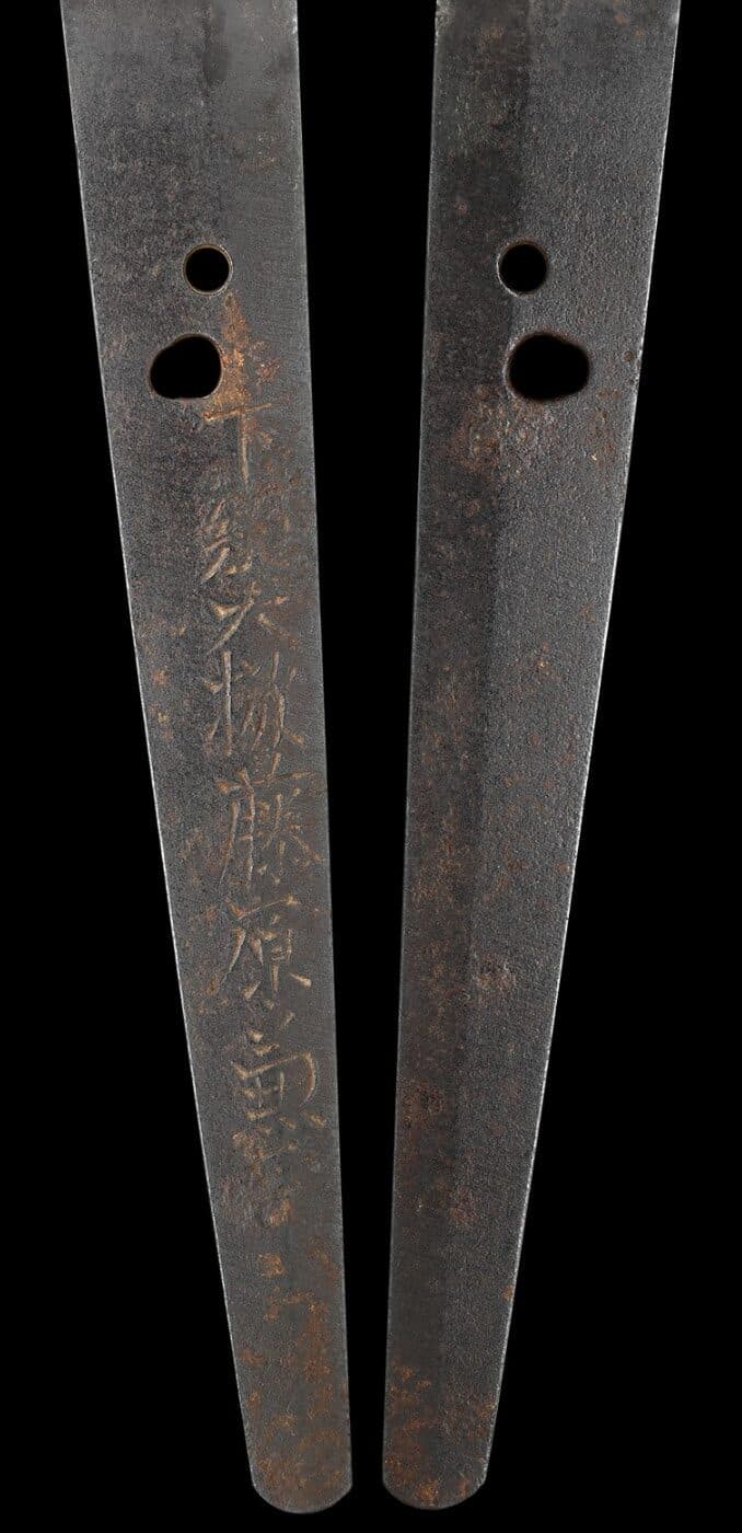 Shimousa Daijō Fujiwara Kanemasa, born Hattori Yoshibei, was a direct descendant of the famous Seki tradition as the fifth-generation grandson of Noshu Seki Kaneho. Active in Echizen, Edo, and Hikone, Kanemasa became celebrated not only for his refined forging techniques but also for his exceptional mastery in decorative carving a skill rarely matched in his era.