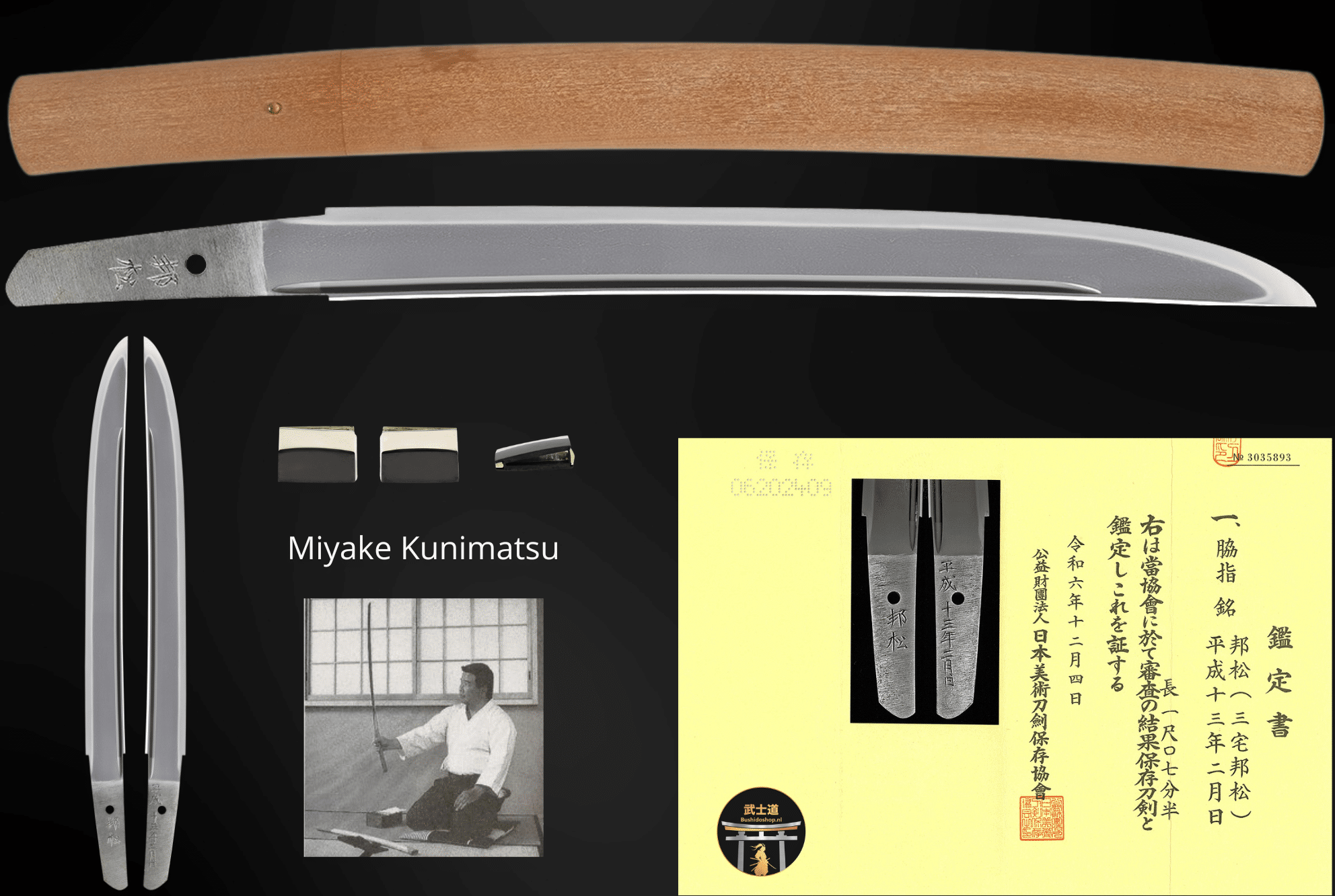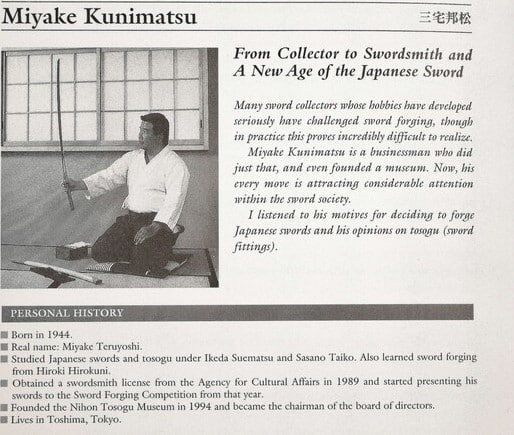 Kunimatsu real name Miyake Teruyoshi is a unique figure within the contemporary Japanese sword world. In addition to being a licensed swordsmith, he is also a polisher, appraiser, and scholar, with deep practical and academic knowledge of the Japanese sword. He studied sword appraisal under Ikeda Suematsu-sensei and learned sword making from Hiroki Hirokuni.