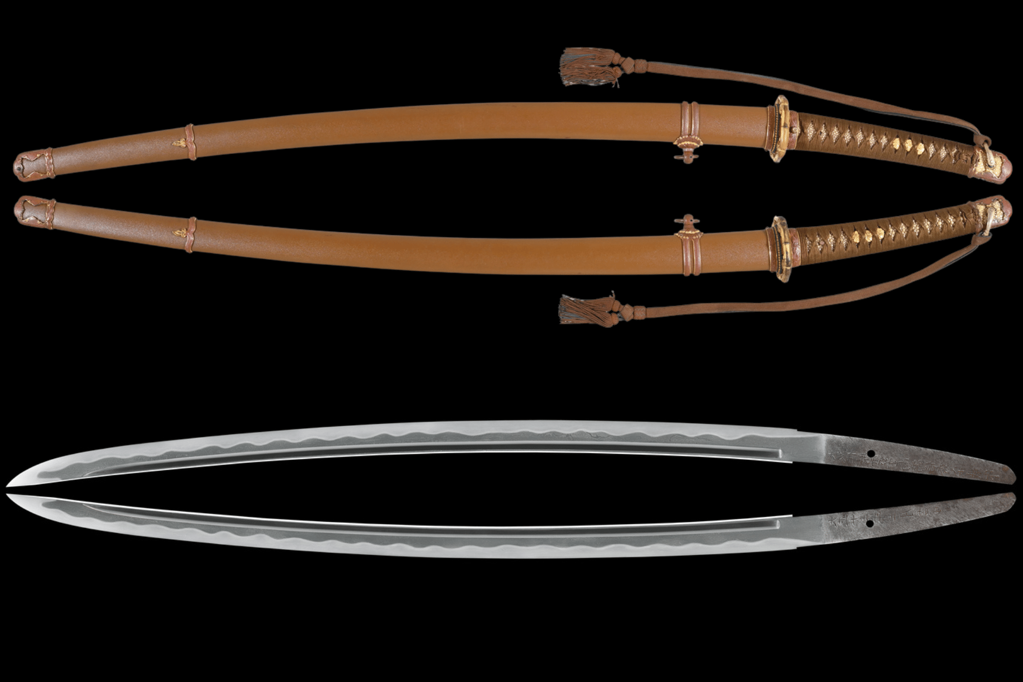 The blade is mounted in a private order Type 98 guntō koshirae, combining the formal outline of early Shōwa military mounts with traditionally made fittings. The brown lacquered saya is equipped with suspension mounts for belt wear, while the tsuka is finished in tightly wrapped brown silk ito over samegawa panels, adorned with gilt floral menuki and copper-alloy fuchi kashira.