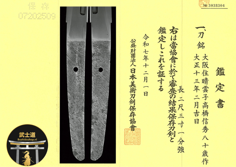 This distinguished katana was forged on an auspicious day in February 1924 (Taishō 13) by Takahashi Nobuhide (高橋信秀), one of the most accomplished senior swordsmiths of the Osaka Gassan tradition and a key figure in the revival of traditional Japanese swordmaking during the late Meiji to Taishō period.